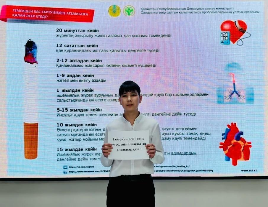 Мектебімізде 19 қараша – Дүниежүзілік темекі шегуден бас тарту күніне орай «Темекі тартқаның – өзіңді құртқаның» атты ақпараттық бұрыш ұйымдастырылды. Бұл іс-шараның мақсаты – оқушыларға темекінің зиянды әсерлері туралы ақпарат беріп, олардың темекі шегуден бас тартуға деген қызығушылығын арттыру болды.