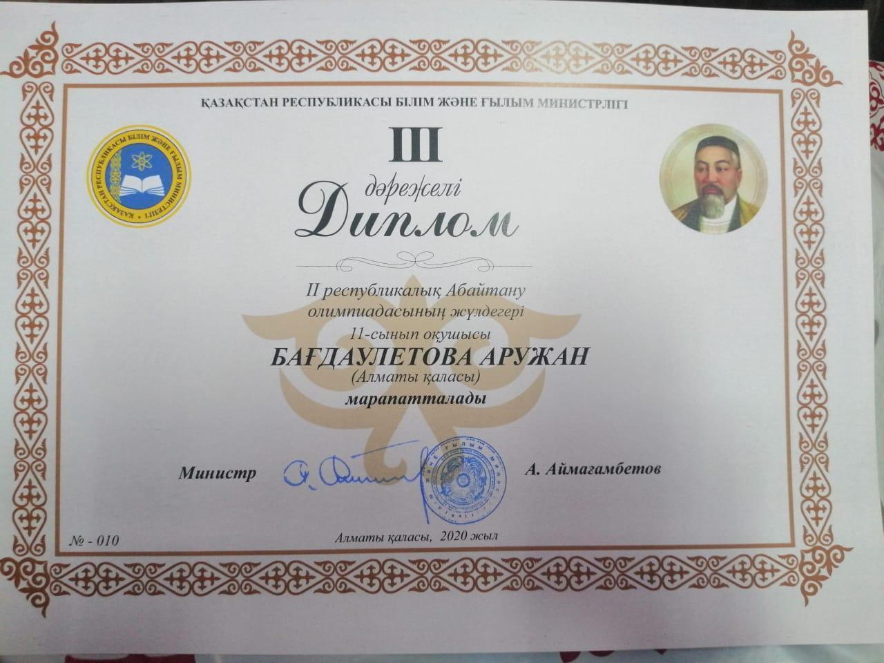 23 январь 2020 0 1 2 3 4 5 Алматы қаласы Турксіб ауданы №162мектеп-гимназияның 11 сынып оқушысы:Бағдаулетова Аружан Республикалық Абайтану олимпиадасынан 3-ші дәрежелі дипломмен марапатталады Осы беттің QR-коды:QR-код этой страницы: