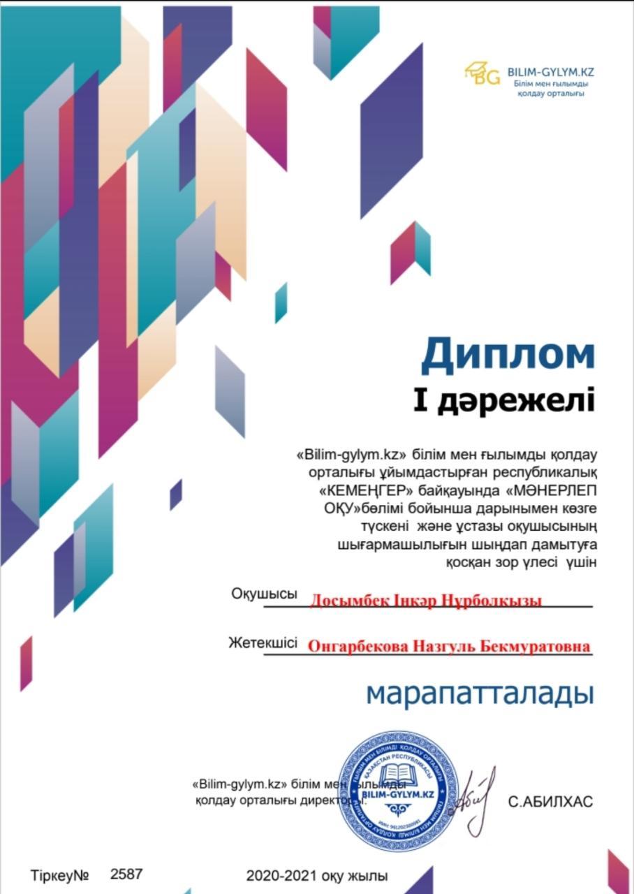 16 ноябрь 2020 0 1 2 3 4 5 Алматы қаласы Турксіб ауданы №162 мектеп-гимназияның 1 "Ә"сынып оқушысы: Досымбек Іңкәр Нұрболқызы "Мәнерлеп оқу" республикалық байқауда 1-дәрежелі Диплом иегері Осы беттің QR-коды:QR-код этой страницы: