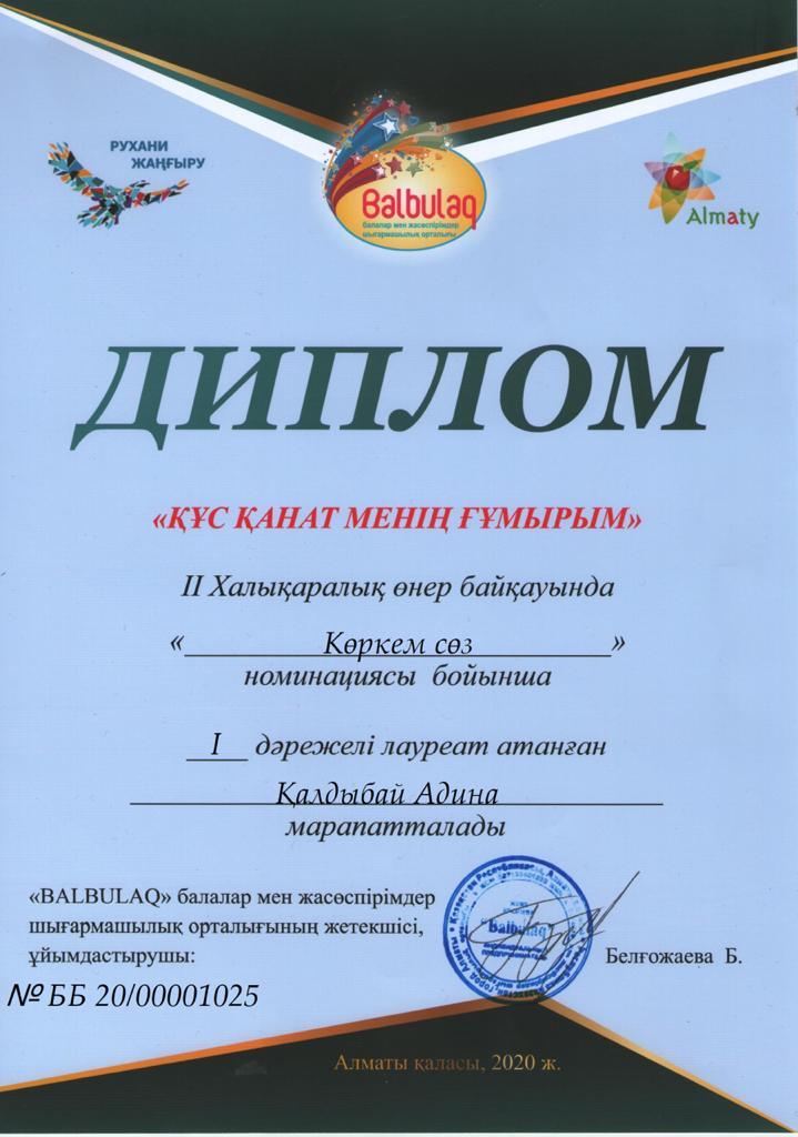 24 ноябрь 2020 0 1 2 3 4 5 Алматы қаласы Турксіб ауданы №162 мектеп-гимназияның 4 "А"сынып оқушысы: Қалдыбай Адина "Құс қанат менің ғұмырым" "Көркем сөз "номинациясы бойынша Бас жүлде иегері Осы беттің QR-коды:QR-код этой страницы: