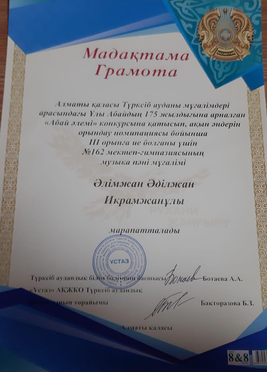 02 декабрь 2020 0 1 2 3 4 5 Алматы қаласы Турксіб ауданы №162 мектеп-гимназияның мұғалімі: Әлімжан Әділжан "Абай әлемі" конкурсына қатысып,ақын әндерін орындау номинатциясы бойынша 3-ші орынға иеленді Осы беттің QR-коды:QR-код этой страницы: