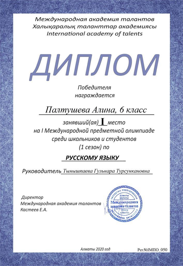 23 декабрь 2020 0 1 2 3 4 5 Алматы қаласы. Турксіб ауданы №162 мектеп-гимназияның 6 сынып оқушысы: Палтушева Алина I Халықаралық пәндік олимпиада орыс тілі пәнінен жеңімпаз марапатталады Осы беттің QR-коды:QR-код этой страницы: