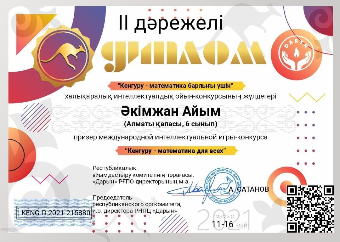 26 май 2021 0 1 2 3 4 5 Алматы қаласы Турксіб ауданы №162 мектеп-гимназияның 6 сынып оқушысы: Әкімжан Айым халықаралық интелектуалдық ойын-конкурсының "Кенгуру - математика" 2 -ші дәрежелі Диплом иегері Осы беттің QR-коды:QR-код этой страницы: