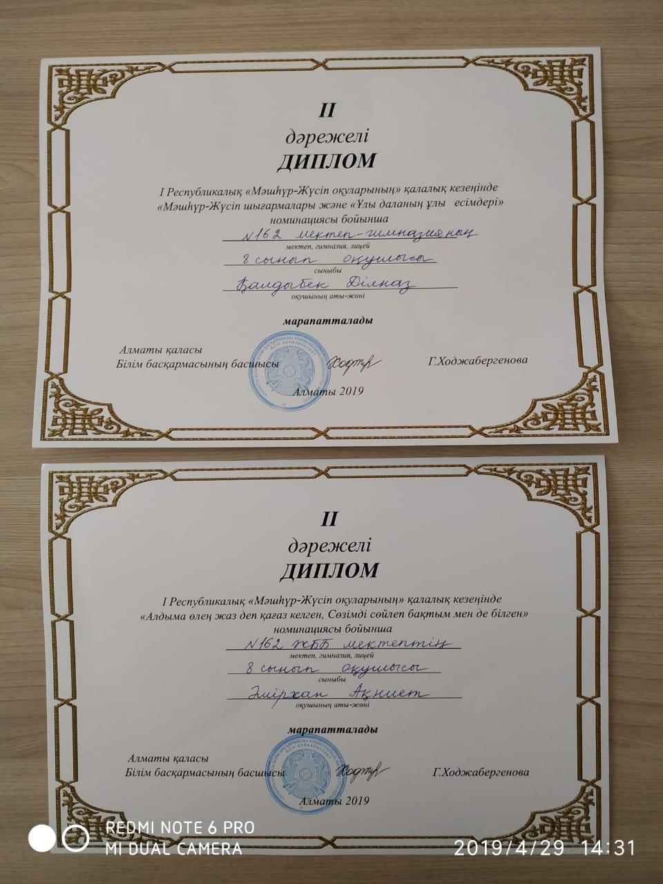 29 апрель 2019 0 1 2 3 4 5 І Республикалық "Мәшһүр-Жүсіп оқушыларының" қалалық кезеңінде ІІ дәрежелі дипломмен 8 а сынып оқушылары Қалдыбек Д және Әмірхан А марапатталды. Осы беттің QR-коды:QR-код этой страницы: