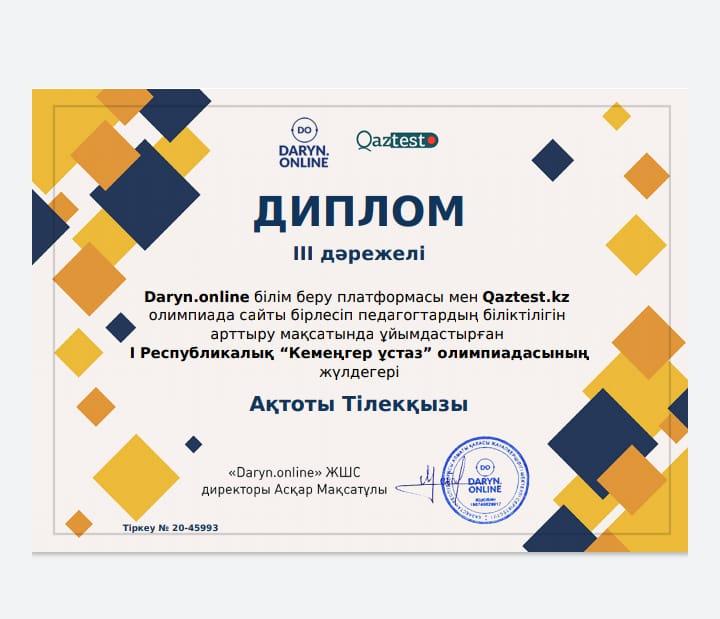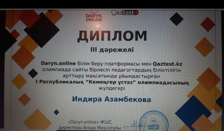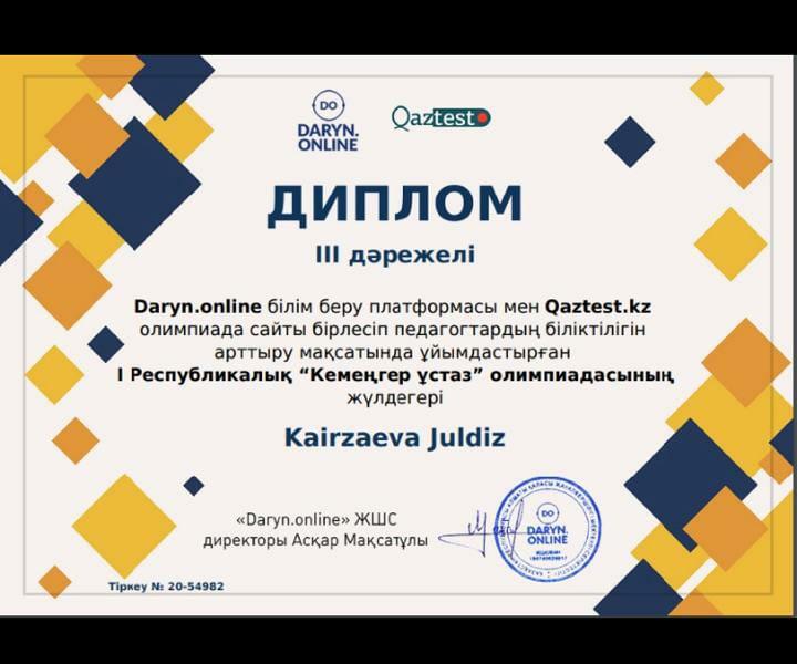 Алматы қаласы. Турксіб ауданы №162 мектеп-гимназиясы І Республикалық "Кемеңгер ұстаз" олимпиадасының ІІ дәрежелі диплом жүлдегері Гүлнұр Орынбаева және ІІІ дәрежелі диплом жүлдегерлері: Ақтоты Тілекқызы, Қайрзаева Жұлдыз, Индира Азамбекова және т.б.