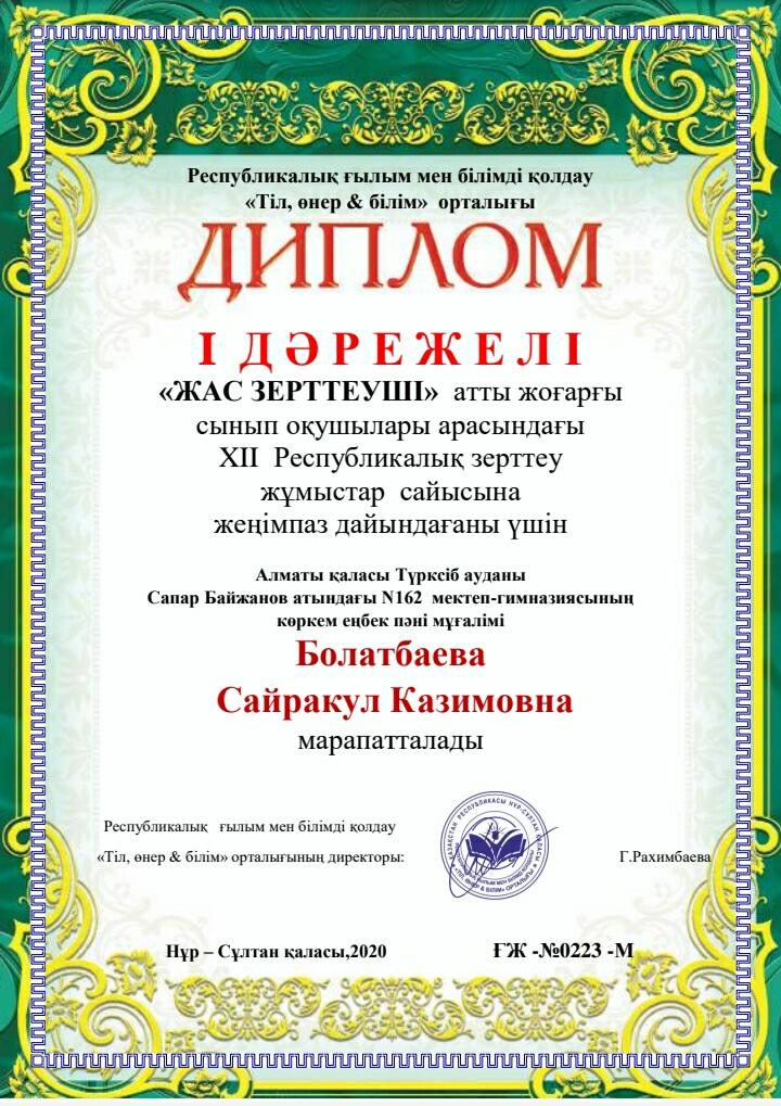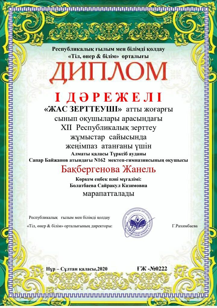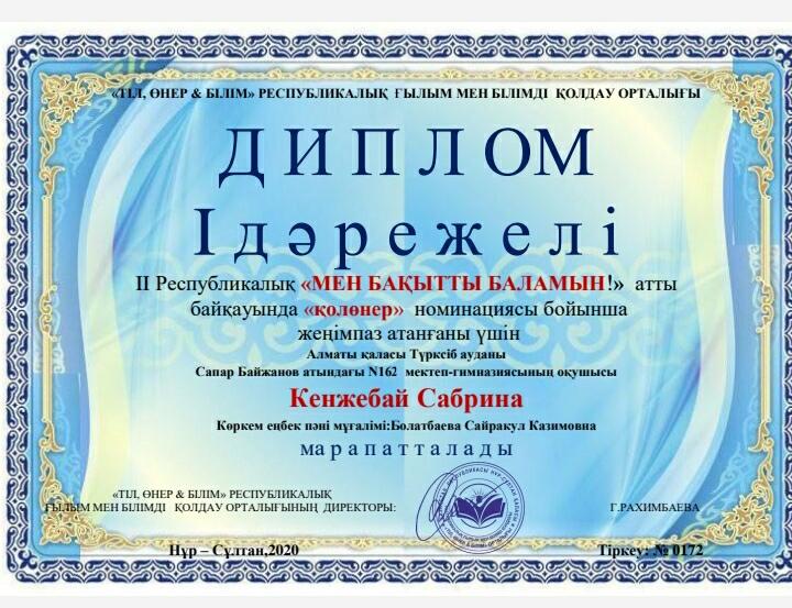 Алматы қаласы Турксіб ауданы №162 мектеп-гимназиясы ХІІ Республикалық зерттеу жұмыстары сайысының жеңімпаздары: Бақбергенова Жанель, Кенжебай Сабрина жетекшісі көркем еңбек пәнінің мұғалімі Болатбаева Сайракул Казимовна
