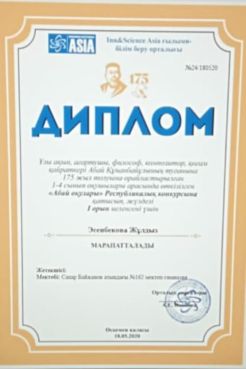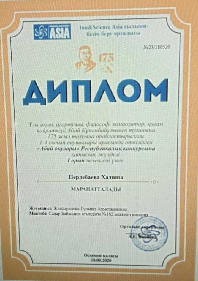 20 май 2020 0 1 2 3 4 5 Алматы қаласы Турксіб ауданы №162 мектеп-гимназиясы Республикалық "Абай оқулары" конкурсының І-орын жеңімпаздары: Пердебаева Хадиша, Эсенбекова Жұлдыз жетекшісі Жандаралова Гульназ Ахметжановна. Осы беттің QR-коды:QR-код этой страницы:
