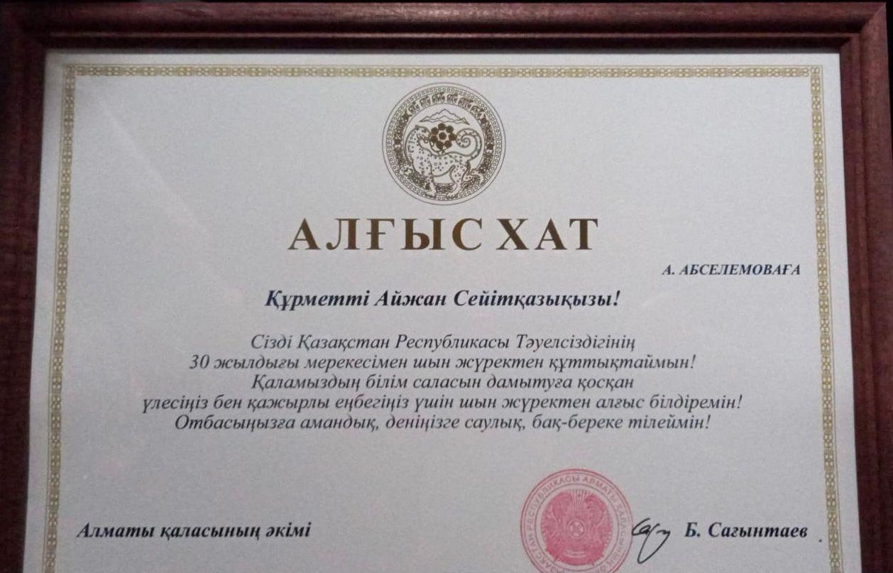 Алматы қаласы Турксіб ауданы №162 мектеп-гимназияның 3"Б" сынып жетекшісі Кенжебаева Айжан Кенжебайқызы Республикалық «Еліміздің еркіндігі-Тәуелсіздік" 1-4 сыныптар арасындағы байқауында қатысқаны үшін Алғыс хатпен марапатталады