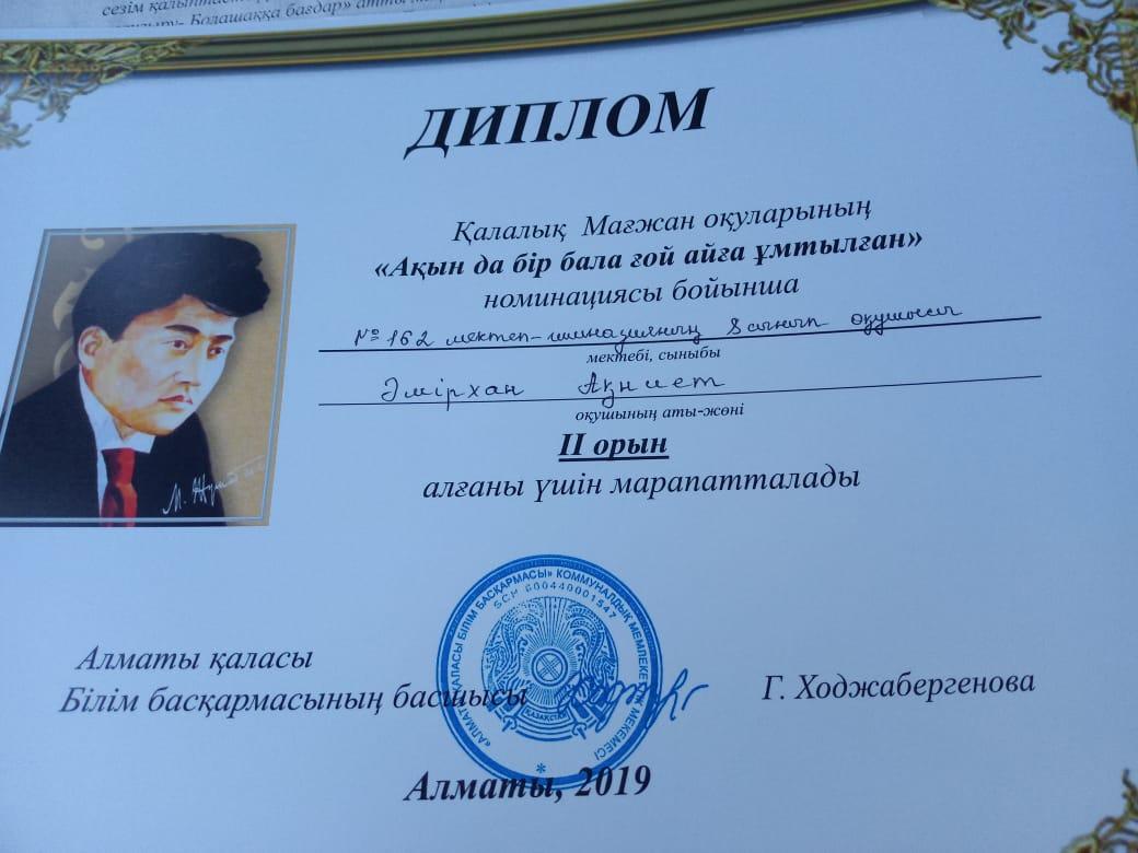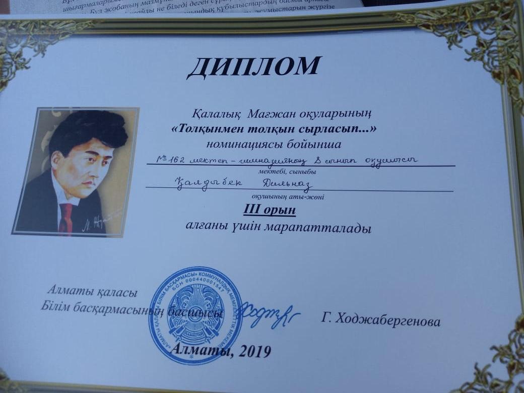 Қалалық Мағжан оқуларының "Толқынмен толқын сырласып..." номинациясы бойынша ІІІ орын, "Ақын да бір ғой айға ұмтылған" номинациясында ІІ орын, "Өлең менің Шолпаным, Айым, Күнім" номинациясында ІІІ орын иеленді.