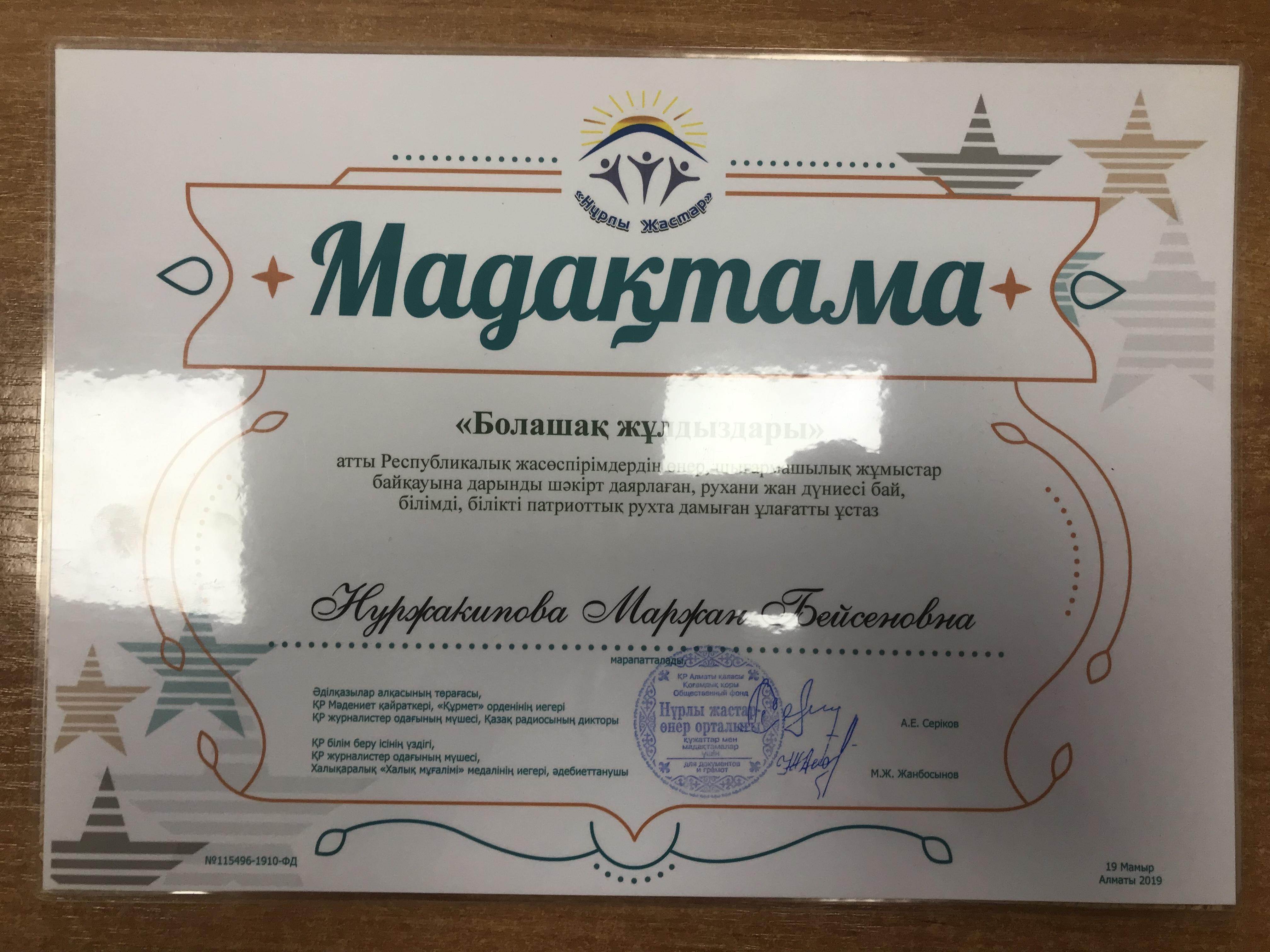 20 май 2019 0 1 2 3 4 5 "Болашақ жұлдыздары" атты Республикалық жасөспірімдердің шығармашылық жұмыстар байқауында орын алға 2 "Ә" сынып оқушылары Құдайберген К, Мадибраймовна А. Осы беттің QR-коды:QR-код этой страницы:
