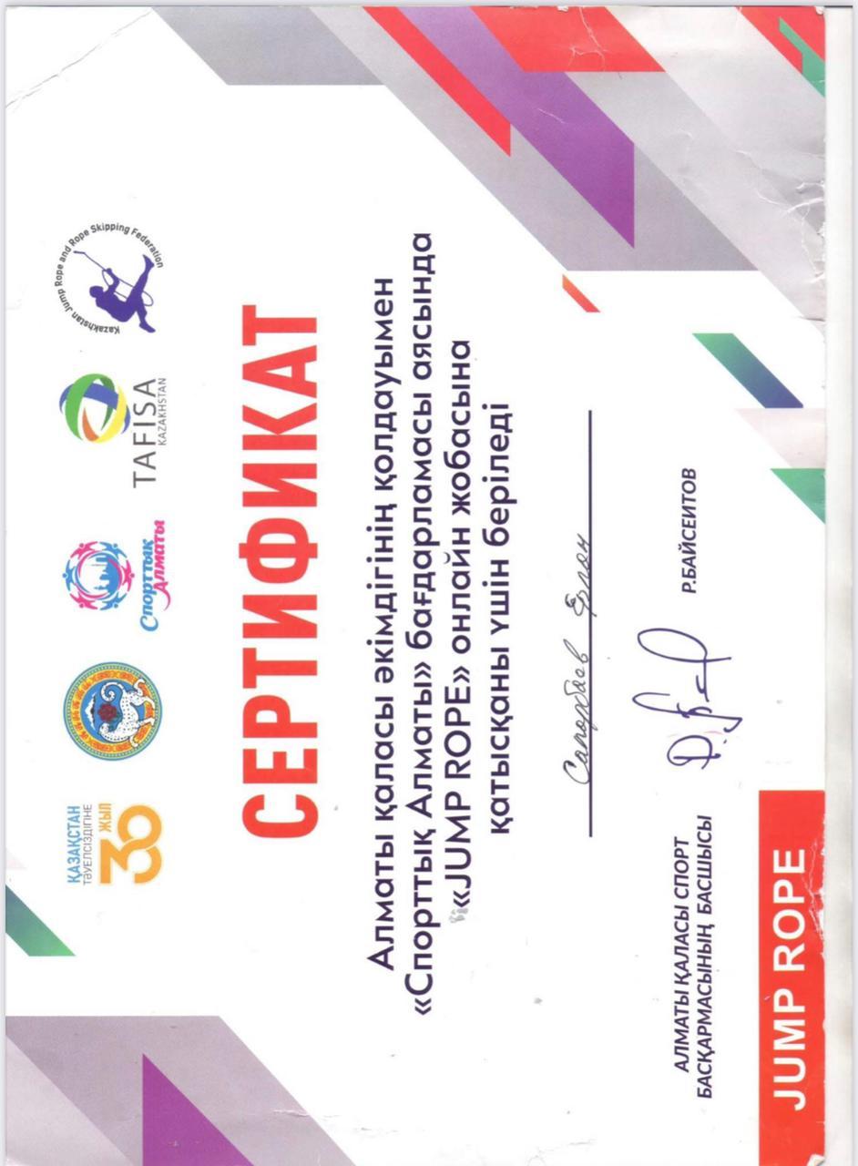 10 август 2022 0 1 2 3 4 5 Алматы қаласы әкімдігінің қолдауымен "Спорттық Алматы" бағдарламасы аясында "JUMP ROPE" онлайн жобасына Сапарбаев Ерлан қатысқаны үшін берілді Осы беттің QR-коды:QR-код этой страницы: