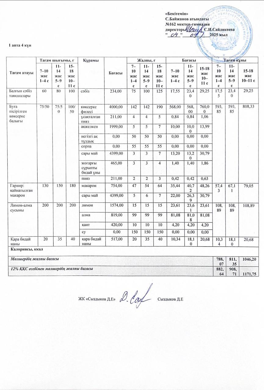 Бағалары көрсетілген перспективалы ақылы ыстық тамақ мәзірі
