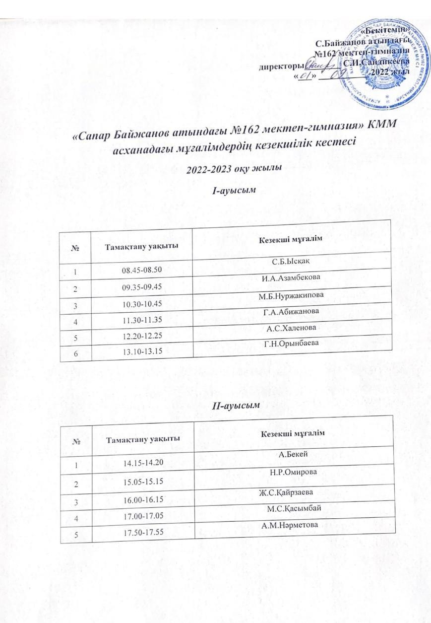 01 сентябрь 2022 0 1 2 3 4 5 "Сапар Байжанов атындағы №162 мектеп-гимназия" КММ асханадағы мұғалімдердің кезекшелік кестесі 2022-2023 оқу жылы Осы беттің QR-коды:QR-код этой страницы: